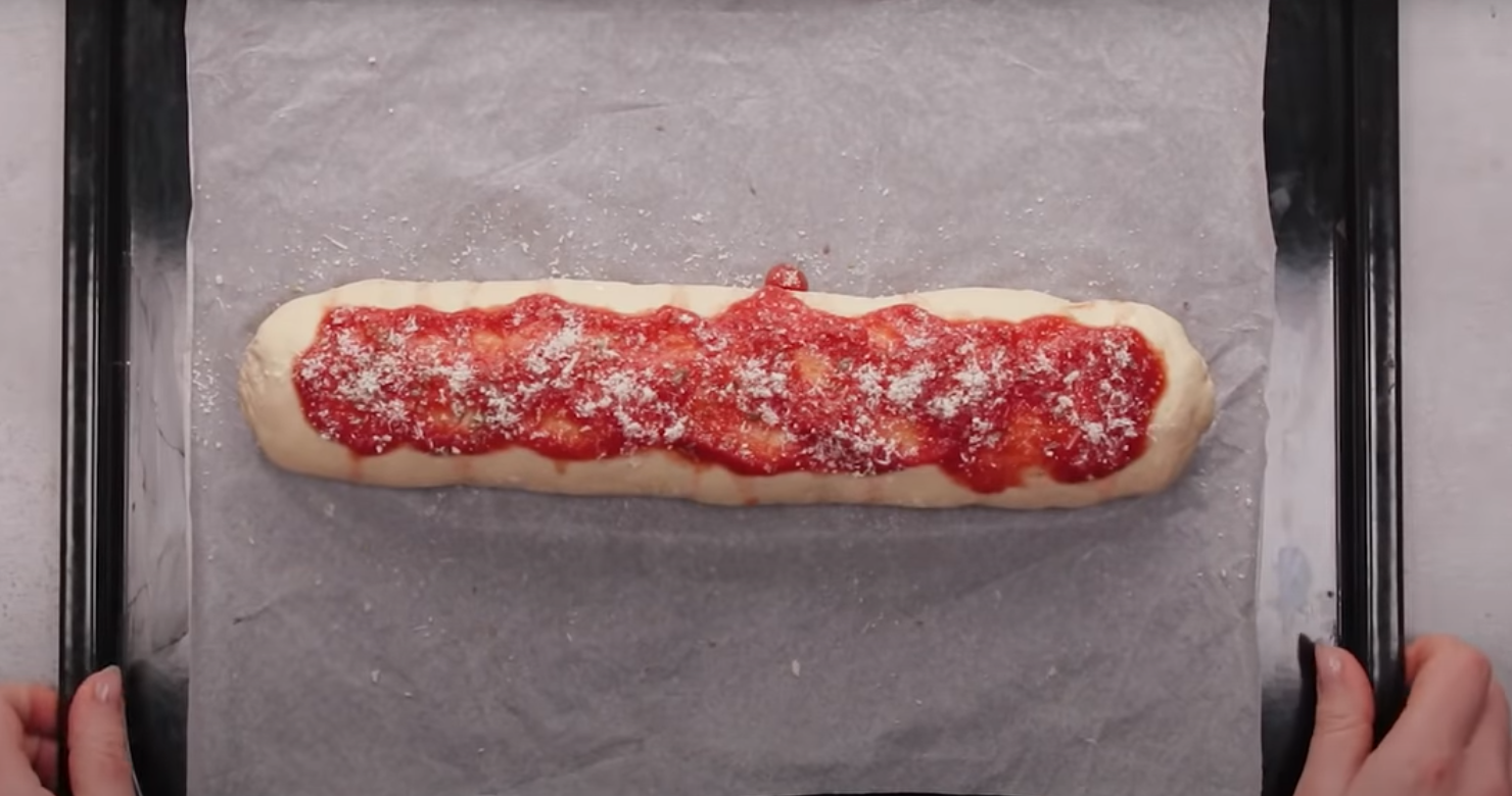 Końcówki dociśnij, blaszkę pokryj papierem do pieczenia. Rulon połóż na blachę i posmaruj górę przecierem pomidorowym, dodatkowo posyp oregano i potartym parmezanem.