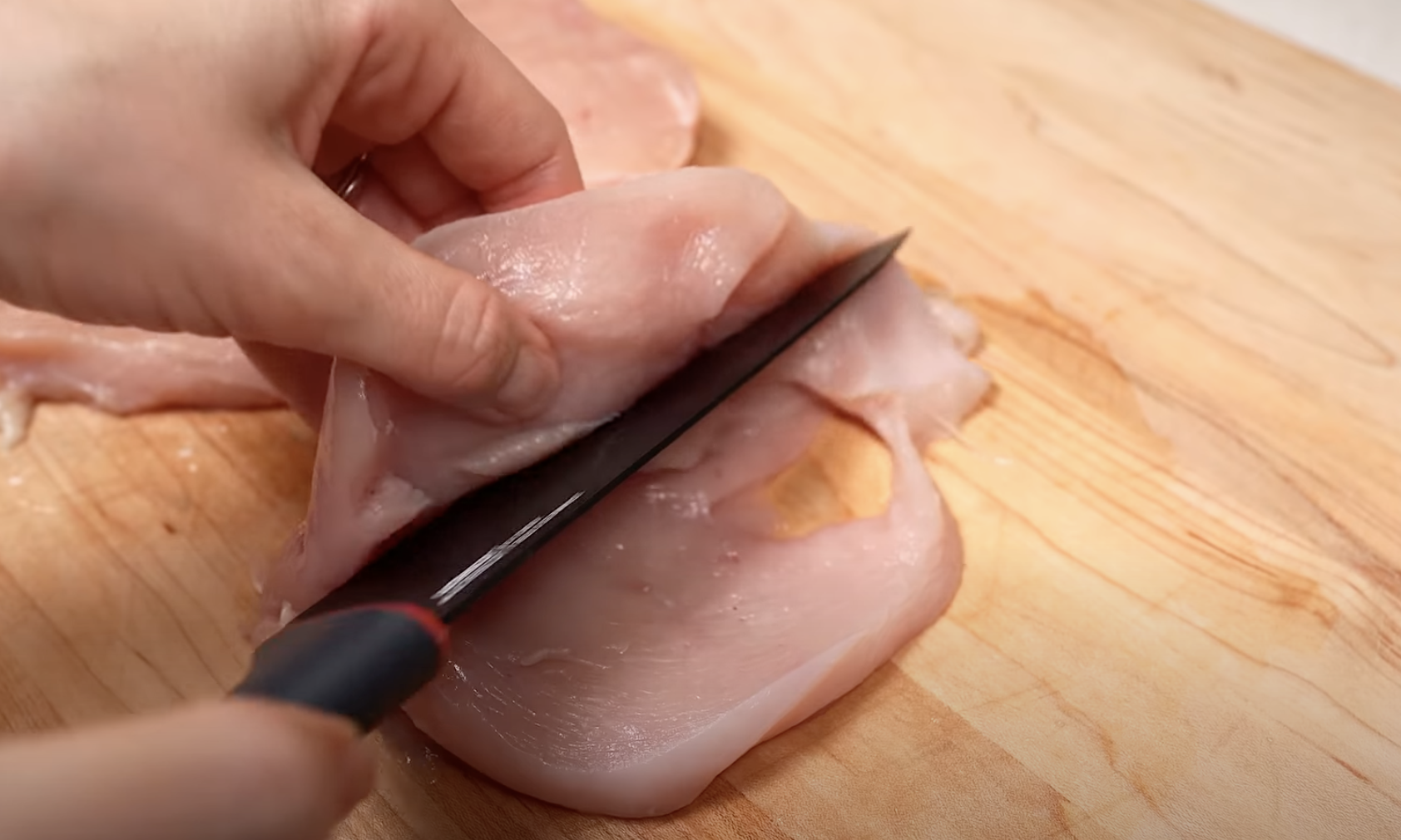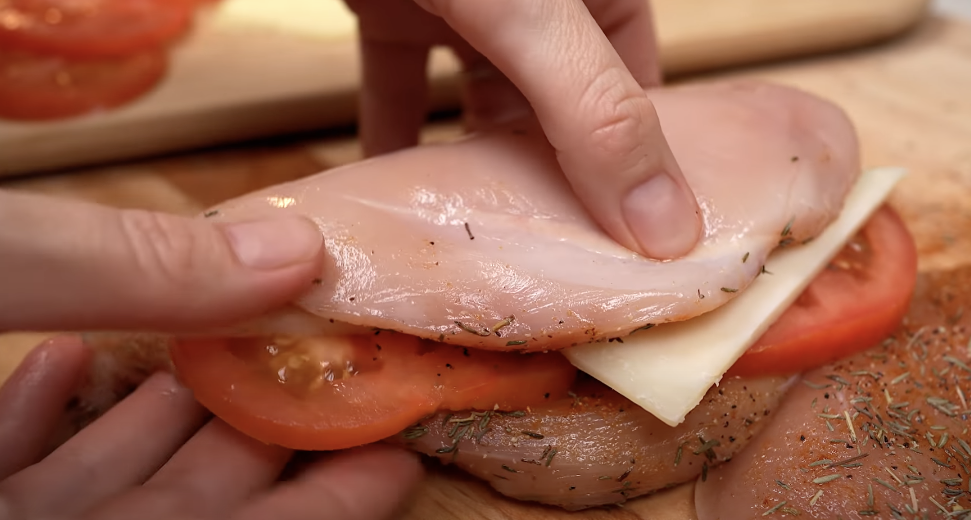 Piersi z kurczaka dokładnie umyć i osuszyć, aby pozbyć się nadmiaru wody. Przeciąć je wzdłuż, ale nie do końca. Ma powstać z tego kieszonka.