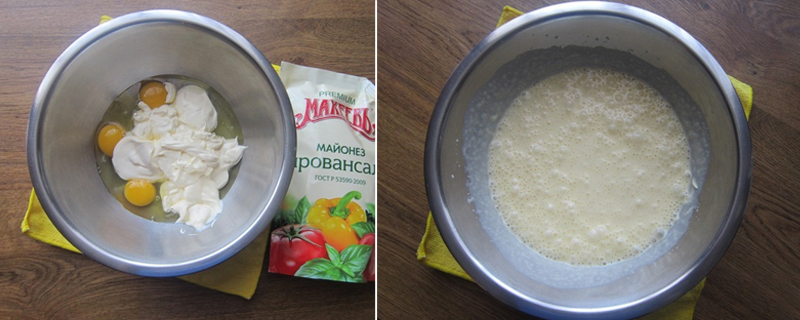 Majonez wymieszać z jajkami, cukrem, solą oraz cukrem waniliowym za pomocą trzepaczki lub przy użyciu miksera. Do tego dodać wodę i przesianą mąkę.
