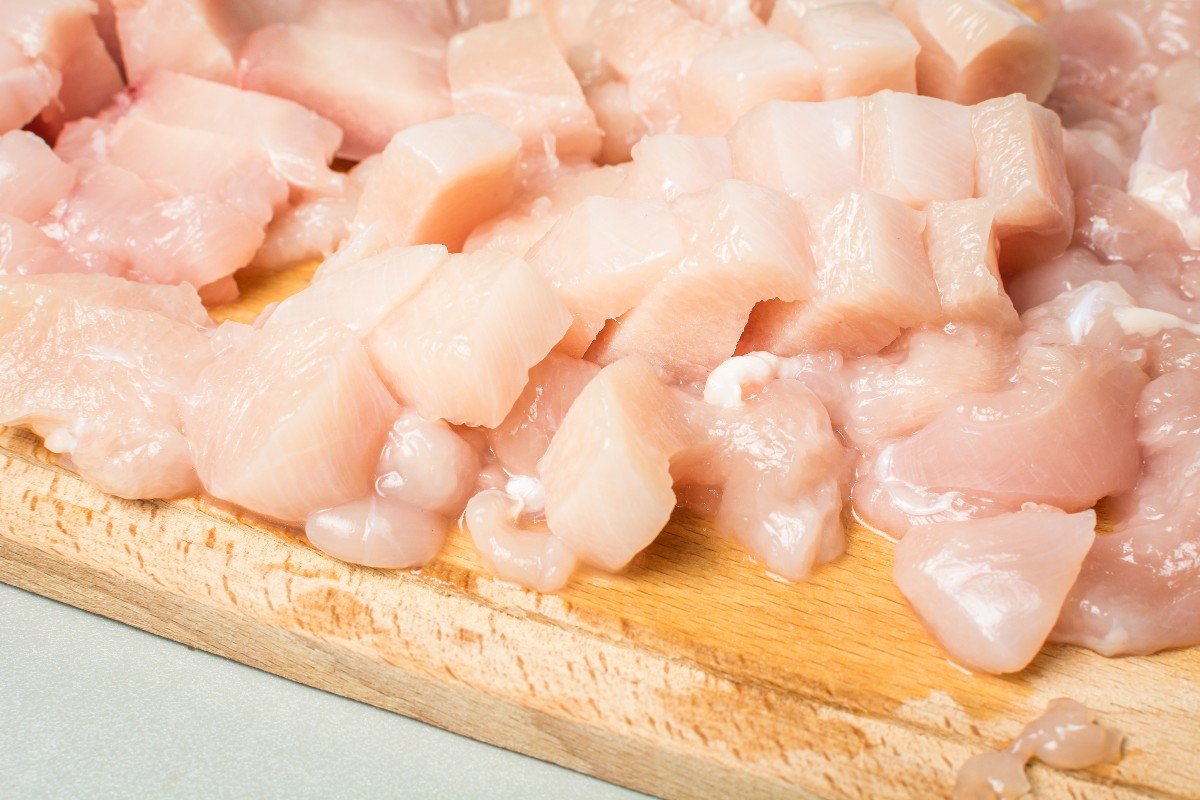 Filet z kurczaka oczyść z resztek skóry i chrząstek. Spłucz dokładnie czystą wodą i pokrój na małe kawałki. Skoncentruj się na wielkości klasycznych bryłek. Dopraw solą i pieprzem.