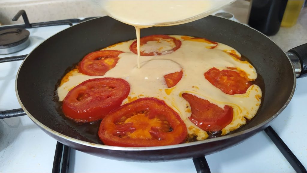 Dodaj sól i pieprz. Dobrze wymieszaj trzepaczką. Wlej trochę oleju na patelnię, podgrzej. Podsmaż na niej plastry pomidora.