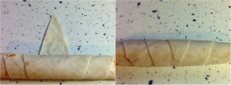 Żółtko dodać do twarogu i wymieszać. Odrobinę przygotowanego farszy umieścić na szerszej krawędzi trójkąta z tortilli i zwinąć w rulon. Aby skleić rulonik, należy końcówkę zwijanego trójkąta posmarować pozostałym białkiem.