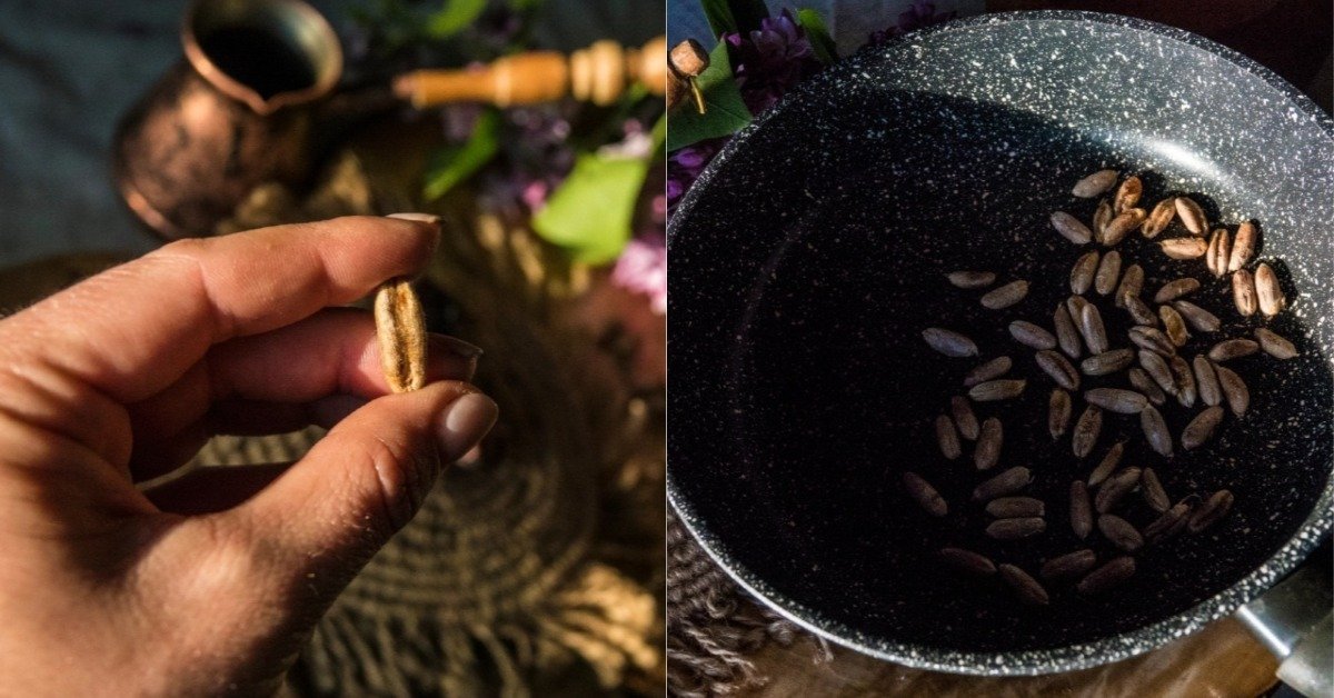 Następnie umieść nasiona na suchej patelni i smaż, aż delikatnie się zarumienią. Ważne, by ich nie przypalić. Ich gotowość poznasz po tym, że stają się kruche.