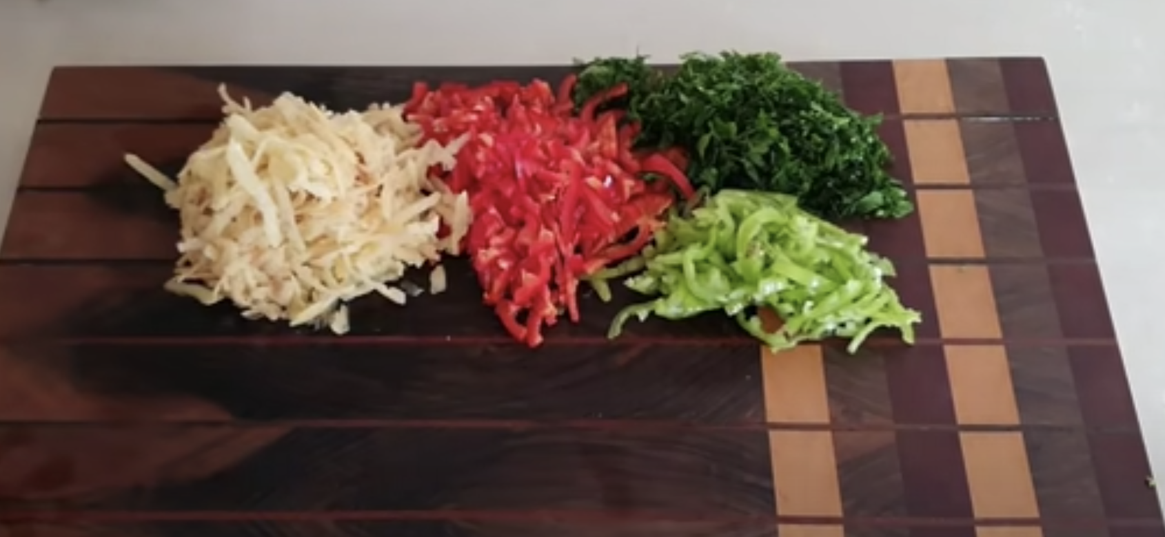 Papryki i natkę kroimy w małą kostkę. Ziemniaka ucieramy na tarce, odciskamy sok.