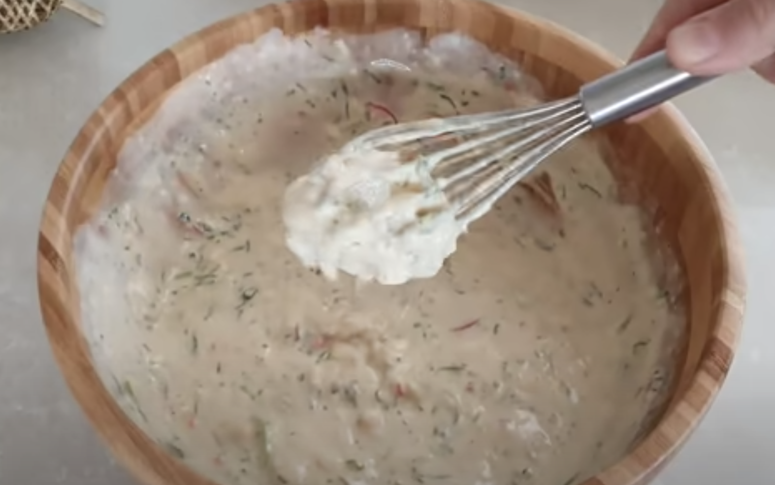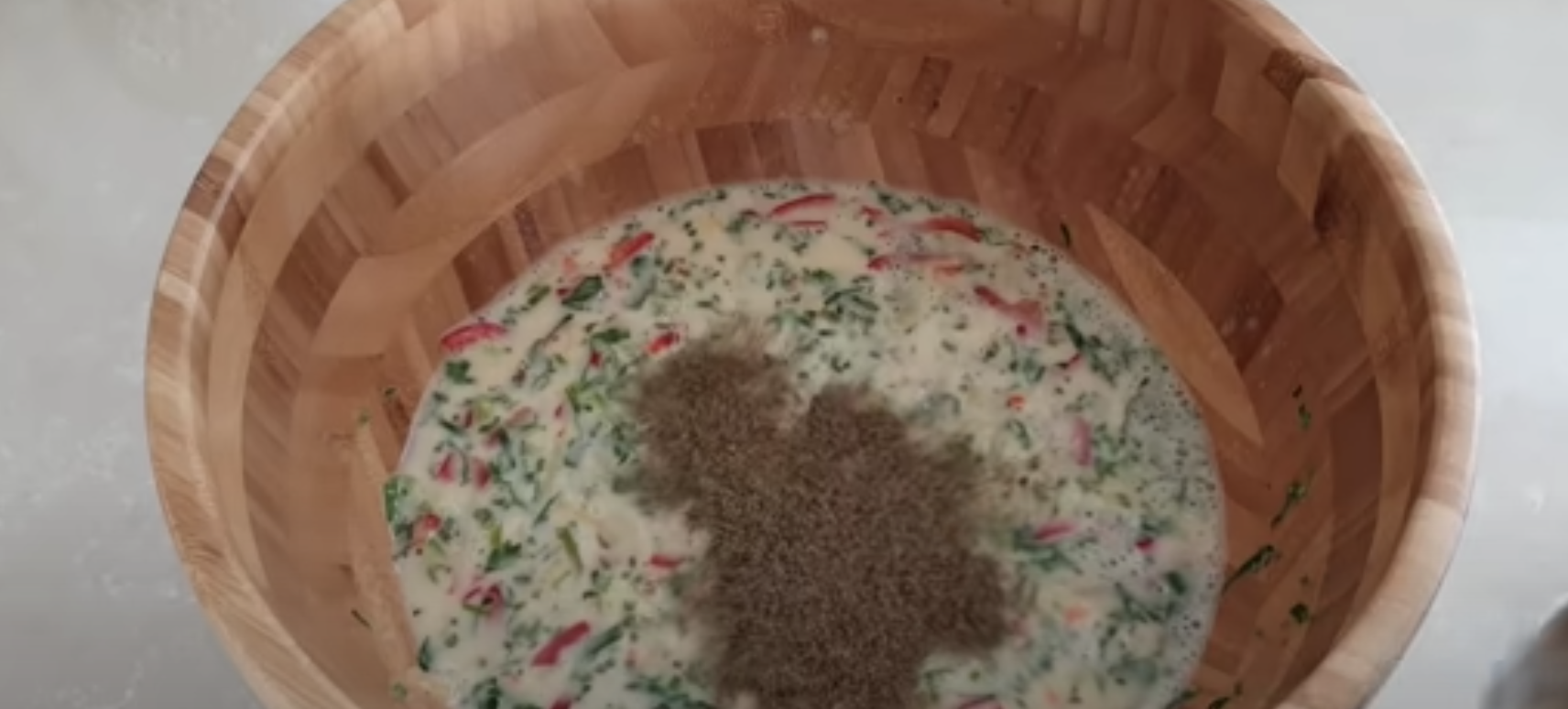 W misce mieszamy jajka, wodę, mleko, cukier i rozdrobnione drożdże, następnie dodajemy warzywa, starty ser oraz przyprawy.
