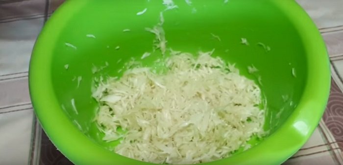 Posiekaj około połowę główki kapusty, tak by w efekcie powstało 400 g posiekanej kapusty. Umieść ją w misce. Cebulę zetrzyj na tarce o grubych oczkach i dodaj do miski z kapustą.