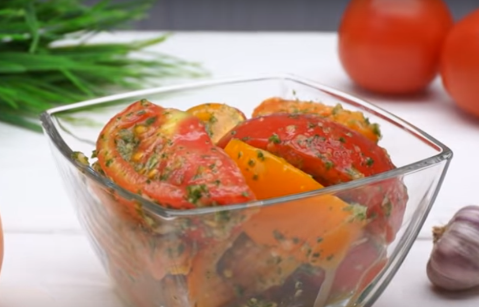 Pomidory oczyszczamy z szypułek oraz łodyg, dokładnie myjemy i kroimy w plastry o preferowanej grubości. Tak przygotowane pomidory wkładamy do wcześniej dokładnie umytego słoika.