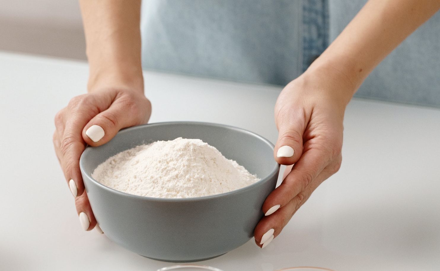 W większej misce mieszamy suche składniki – cukier, kaszę mannę i mąkę.