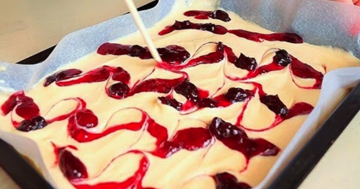 Po powierzchni rozprowadzić dowolny w smaku dżem za pomocą szpikulca. Potem wylać drugą część masy, którą wcześniej zostawiło się.