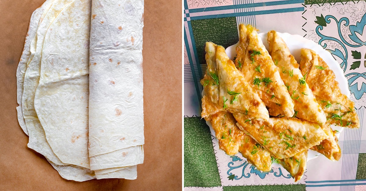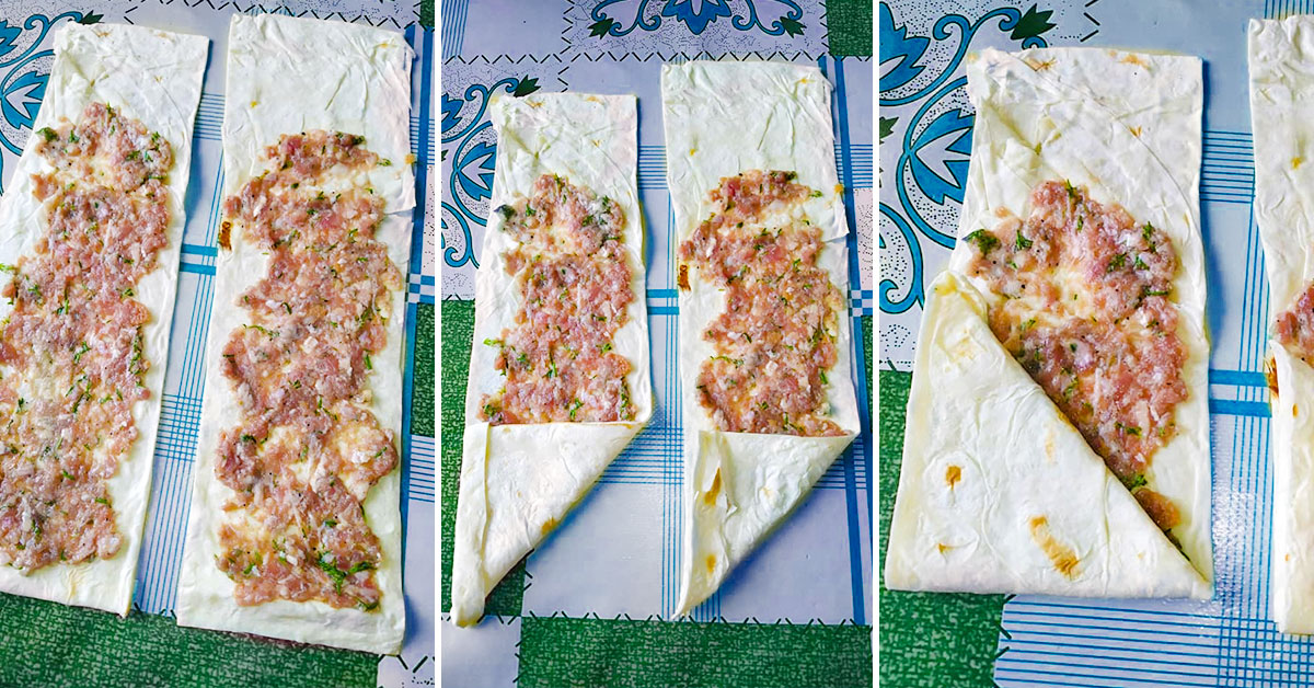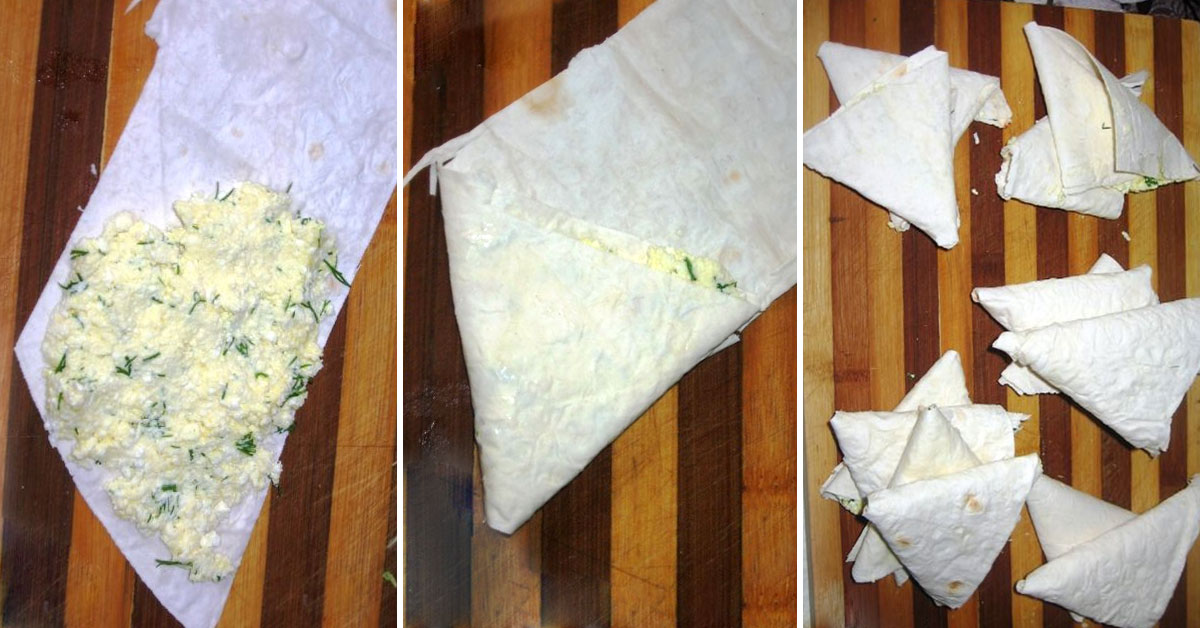 Pokrój tortille w długie, szerokie paski, a następnie zawiń w trójkąty jak na zdjęciu. Najważniejsze, żeby nie wkładać zbyt dużo nadzienie, aby łatwo było je złożyć.