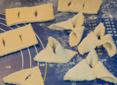Ciasto kroimy na prostokąty, w każdym wycinamy otwór w środku. Jeden koniec prostokąta przekręcamy przez otwór, tworząc łuk.