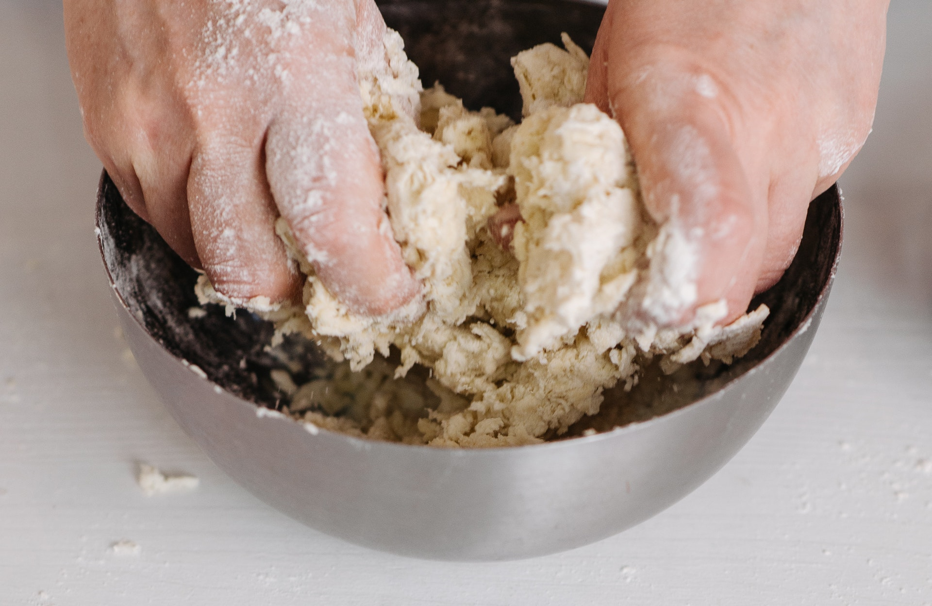 Przygotowanie tego ciasta jest zaskakująco proste. Wystarczy jedna duża miska. W niej mieszamy wszystkie składniki ciasta. Następnie rozwałkowujemy ciasto na posypanej mąką desce, aż stanie się elastyczne, jednolite i gładkie.