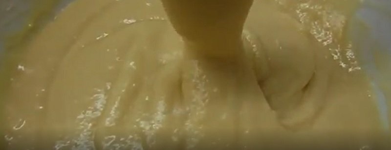 Przesiej mąkę przez sito razem z proszkiem do pieczenia i dodaj do mieszaniny. Dokładnie wymieszaj, ciasto nie może mieć żadnych grudek, ma być aksamitne i gęste jak śmietana.