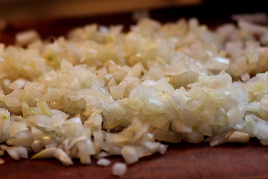 Drobno posiekaj cebulę. W ten sam sposób drobno posiekaj boczek.