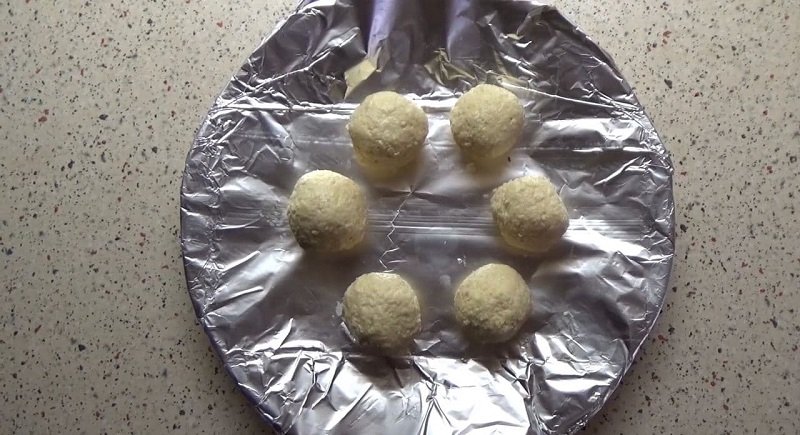 Z masy waflowo-czekoladowej uformuj okrągłe kuleczki, wkładając do środka po 1 migdale. Gdy wszystkie kulki są gotowe, włóż je do lodówki na 20 minut.