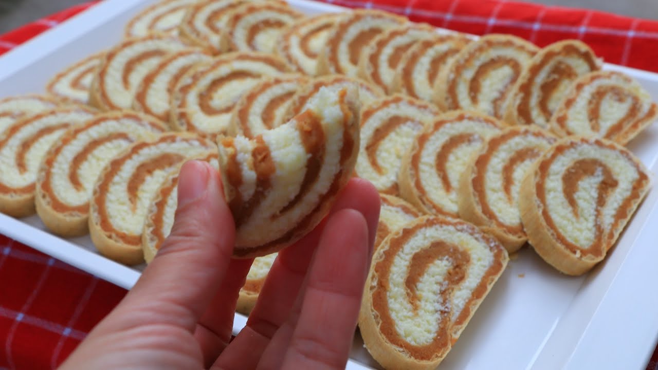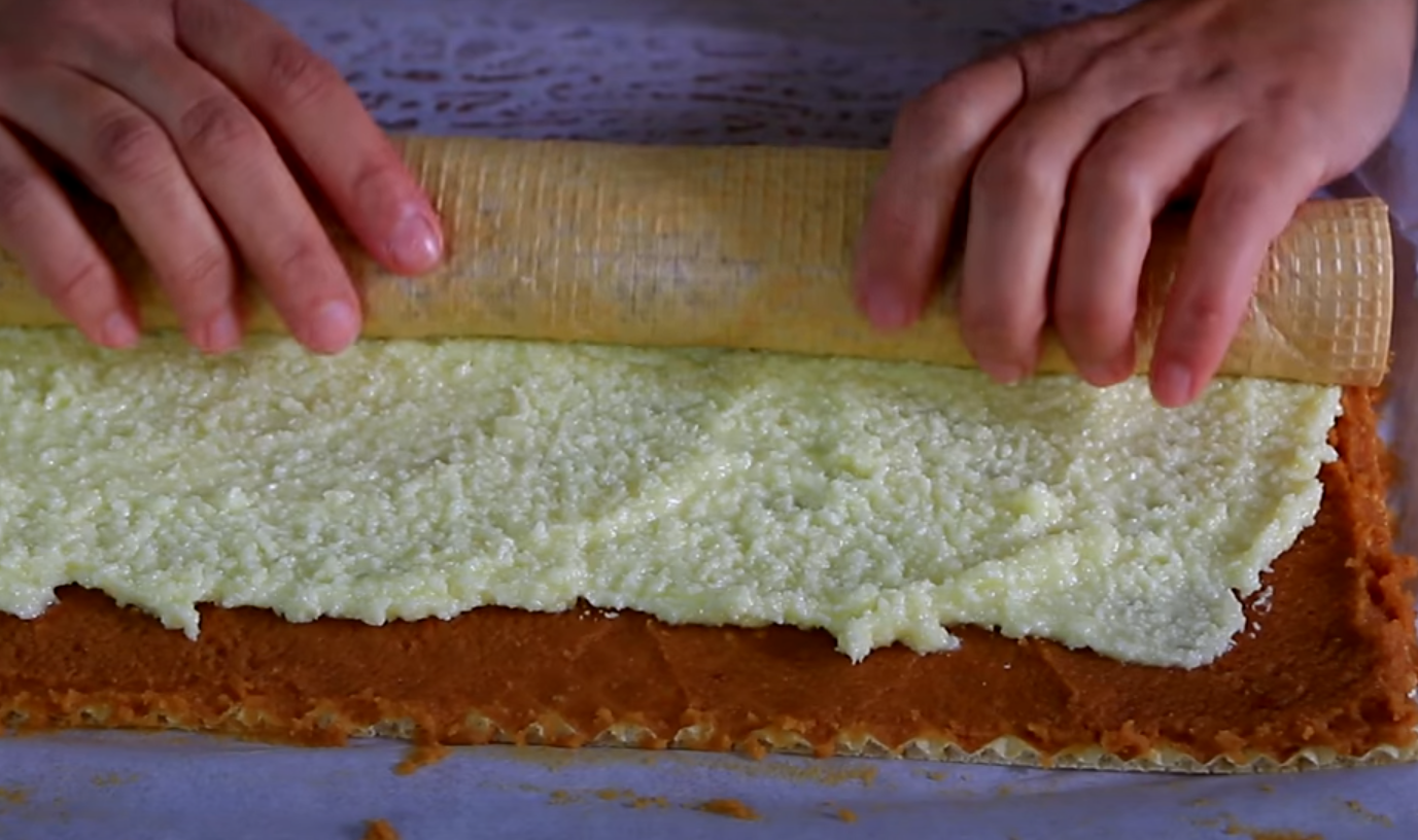W kolejnym kroku zajmij się drugim nadzieniem: rozpuść w garnku masło, dodaj cukier i wodę. Mieszając na średnim ogniu, wprowadź do tej mieszanki mleko w proszku. Gdy wszystko dobrze się połączy, dodaj wiórki kokosowe. Nałóż tę masę na warstwę z karmelem, a następnie zawiń arkusz.