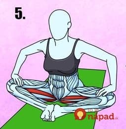 Siedząc wygodnie na podłodze w pozycji tureckiej, połącz stopy razem. Powoli wyprostuj się i powoli przyciskaj kolana do podłogi, pomagając sobie dłońmi. To ćwiczenie rozciąga mięśnie dolnej części pleców, klatki piersiowej oraz bioder. Życzymy powodzenia!