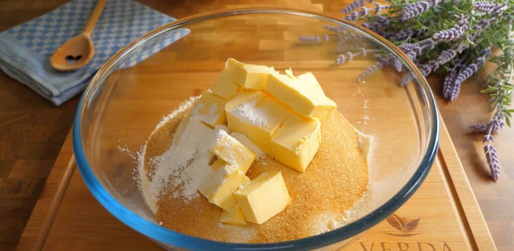- Przesiej mąkę do dużej miski. Dodaj cukier, brązowy cukier oraz proszek do pieczenia. Następnie dodaj zimne masło pokrojone na kawałki oraz roztrzepane jajka.