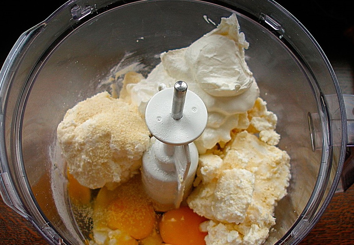 W czasie, kiedy ciasto będzie chłodzić się w lodówce, w osobnym naczyniu wymieszać śmietanę z jajkami, cukrem i cukrem wanilinowym oraz twarogiem.