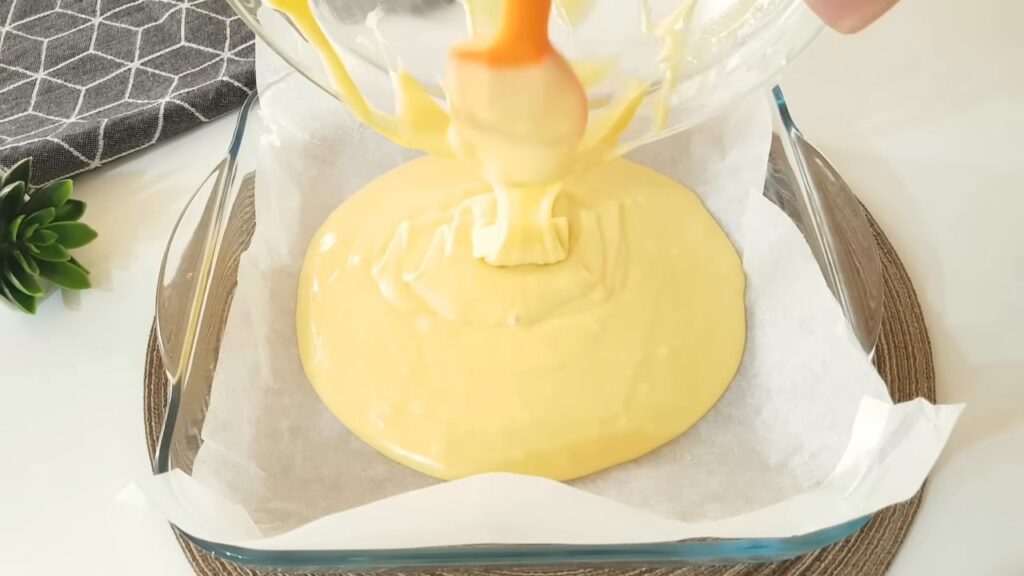 - Wlać ciasto do formy i równomiernie rozprowadzić.