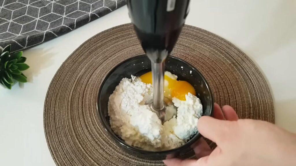 - W małej misce połączyć twaróg, jajko, cukier, mąkę kukurydzianą oraz cukier waniliowy. Wszystko dokładnie wymieszać przy użyciu ręcznego miksera, aż do uzyskania gładkiej masy.