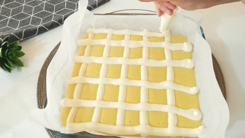 - Krem twarogowy przełożyć do woreczka dekoracyjnego i wycisnąć na cieście, tworząc kratkę.