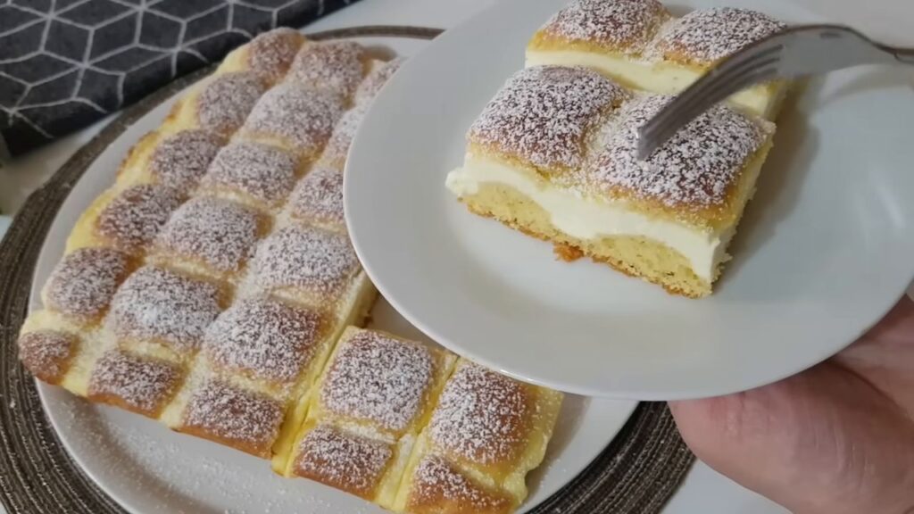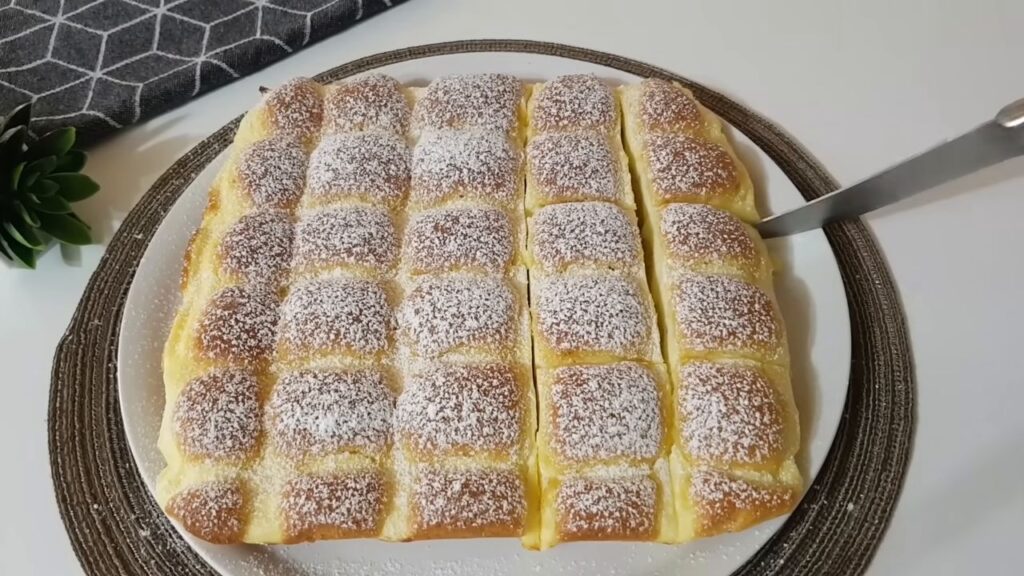 - Po upieczeniu wyjąć ciasto z piekarnika i posypać cukrem pudrem.