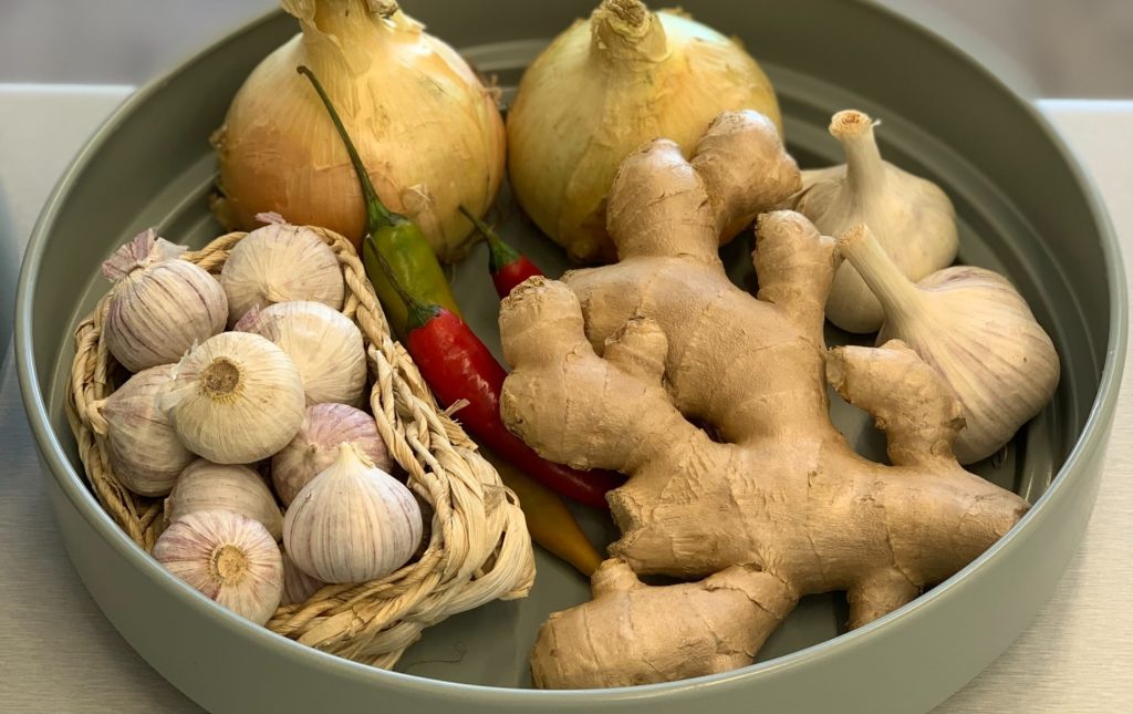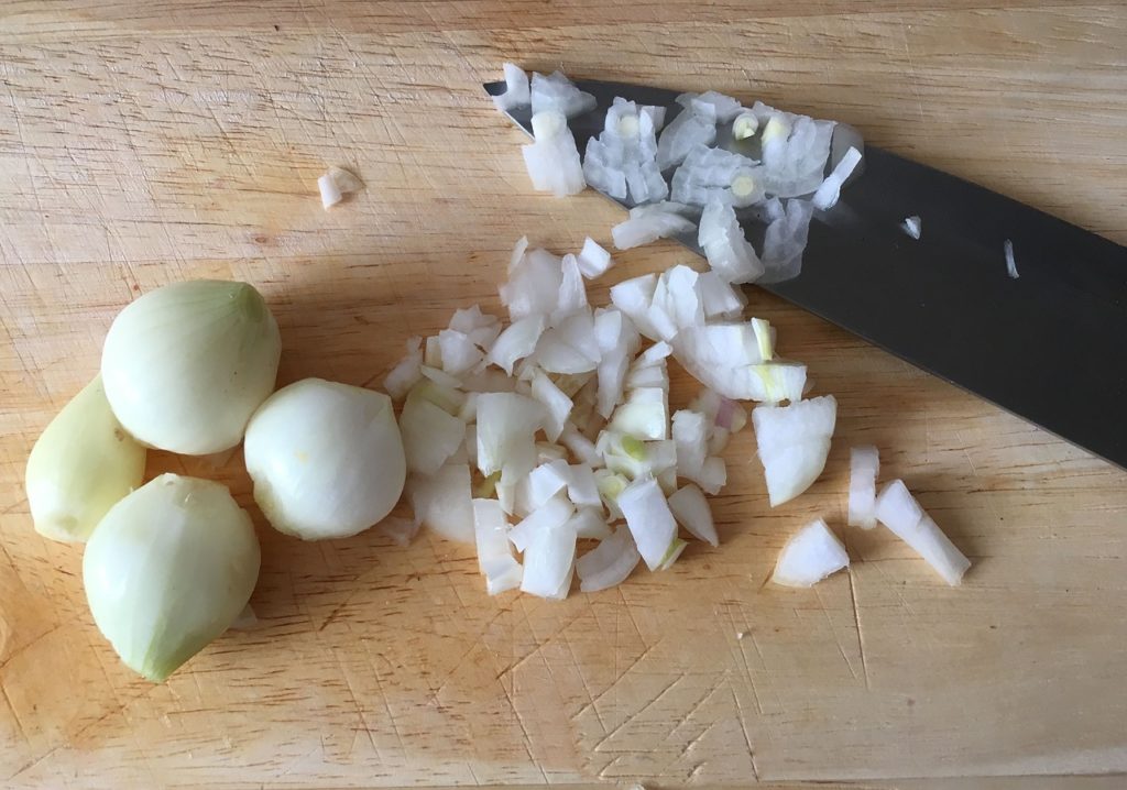 Początek to obranie cebuli i posiekanie jej na drobno. Następnie zabierzemy się za czosnek, który także obieramy i siekamy. Imbir wymaga zważenia – potrzebujemy dokładnie 30 g, po czym należy go pokroić w cienkie plasterki.