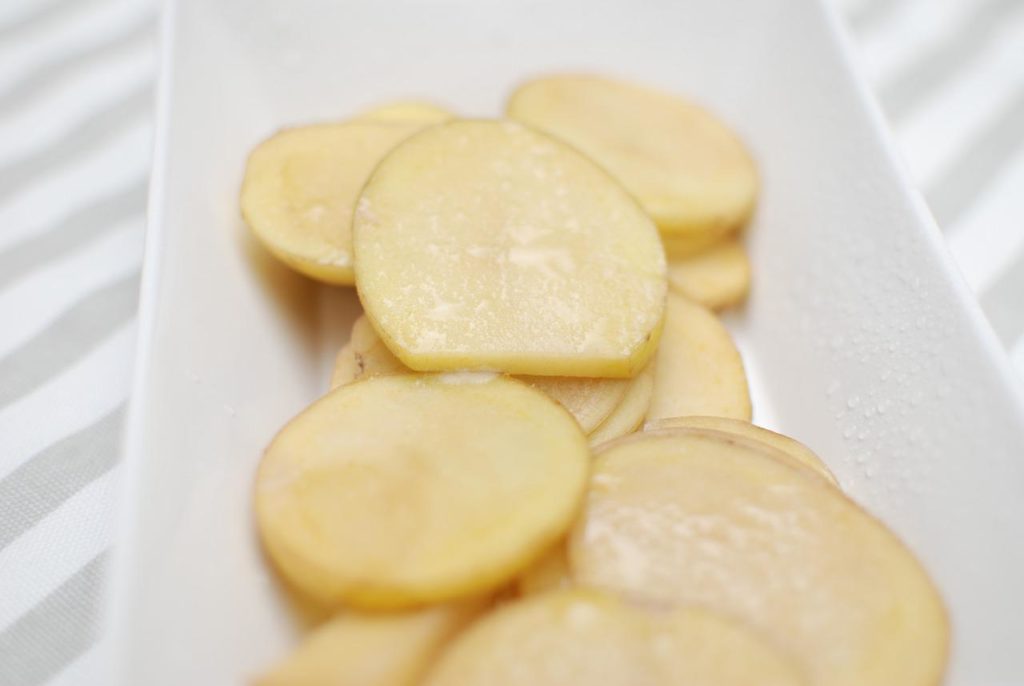 Obierz, umyj i pokrój ziemniaki na plastry. Następnie dodaj do nich mieloną paprykę, czarny pieprz i olej, a potem umieść w żaroodpornym naczyniu i wszystko dobrze wymieszaj rękoma.