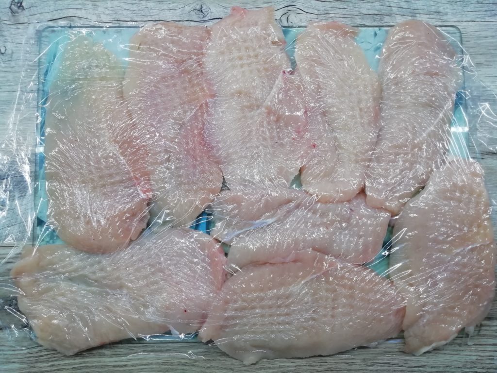 Rozetnij na pół piersi kurczaka poziomo, przykryj folią i delikatnie rozbij tłuczkiem.