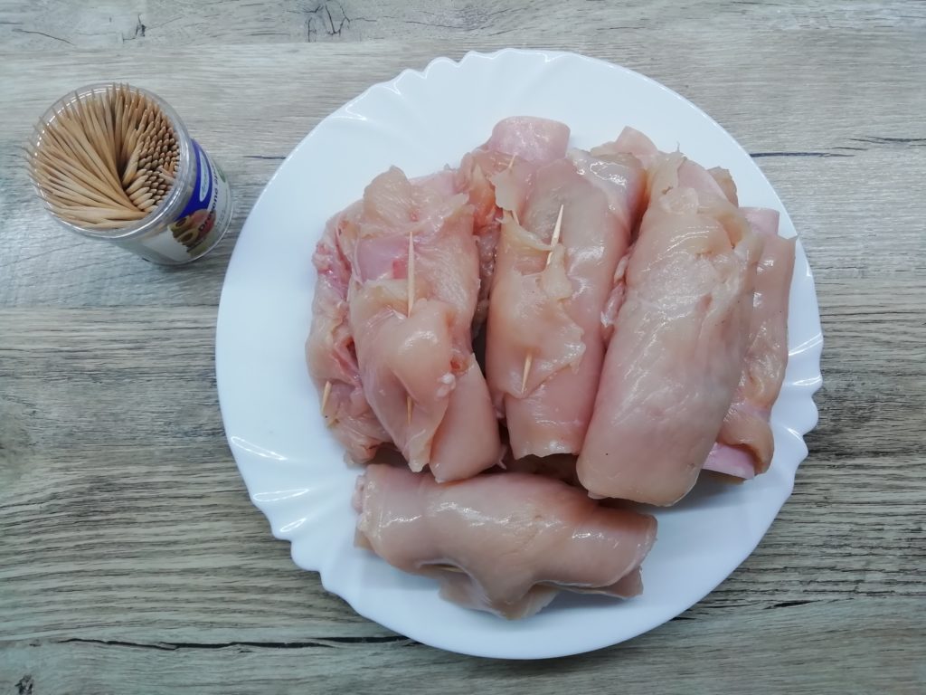 Następnie piersi z kurczaka posmaruj majonezem i nałóż farsz, a potem zawiń roladki.