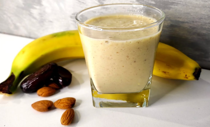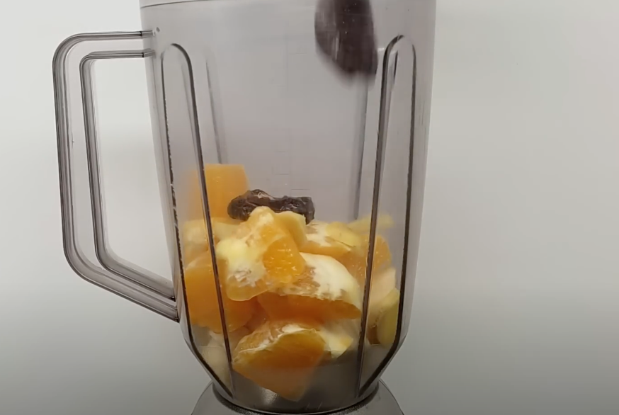 - Umieść wszystkie składniki w blenderze: banana, pomarańczę, imbir, daktyle, migdały, płatki owsiane i mleko.