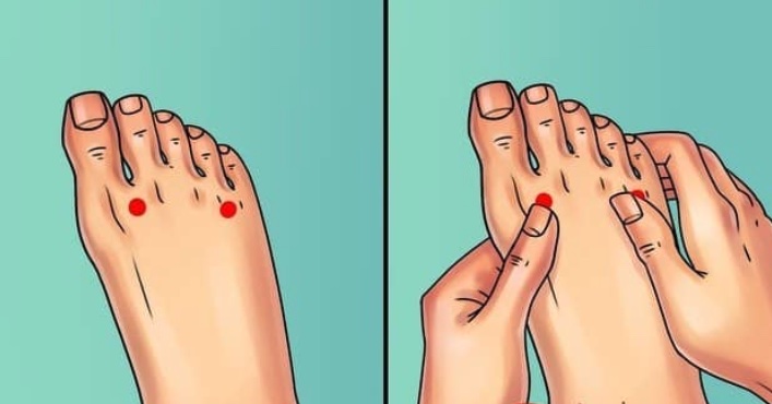 Jeżeli pod koniec dnia Twoje stopy są zmęczone i obolałe, znajdź punkty akupresury jak przedstawiono na ilustracji – znajdują się one między dwoma pierwszymi i dwoma ostatnimi palcami. Połóż na nich kciuki i masuj je lekko przez 10-15 minut. Te punkty połączone są z odcinkiem szyjnym kręgosłupa, więc taki masaż sprawdzi się na spiętą szyję.