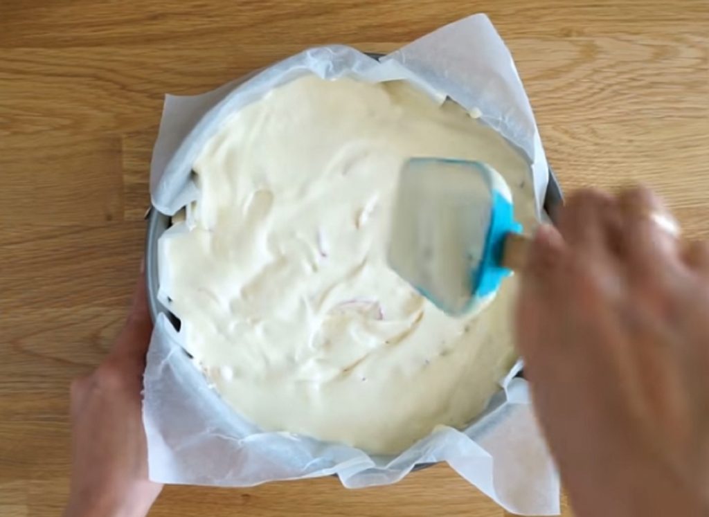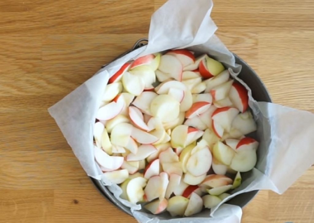 Weź okrągłą tortownicę i wyłóż ją papierem do pieczenia. Następnie przełóż połowę ciasta do formy i dobrze wygładź szpatułką. Na cieście ułożyć cienkie plasterki pokrojonych w plasterki jabłek tak, aby pokryły całą jego powierzchnię. Następnie wylej resztę ciasta na jabłka i stuknij kilka razy foremką o blat, aby dobrze osiadła wokół jabłek i spłaszczyła się na powierzchni.