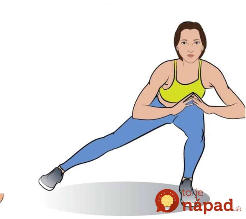Utrzymuj nogi lekko ugięte w kolanach, a dłonie złączone pod brodą. Kiedy robisz krok na szerokość ramion, zacznij od prawej strony, wróć do pozycji startowej i wykonaj ruch w lewą stronę. Ręce pozostają nieruchome, a ciało lekko pochylone do przodu. Wykonaj po 10 powtórzeń na każdą stronę.