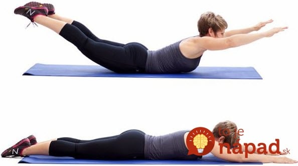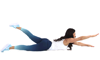 To ćwiczenie jest podobne do suchego pływania. Tym razem podnosisz jednocześnie ręce i nogi. Wykonaj 15 powtórzeń.