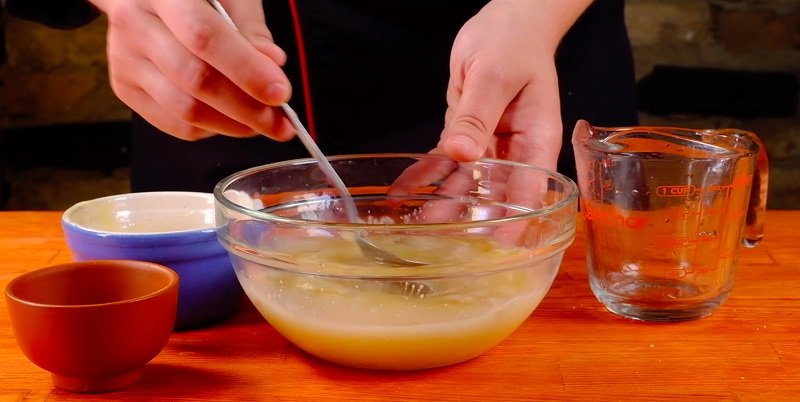 Przesiej mąkę do płynnej mieszaniny i zagnieć szybko ciasto zanim ostygnie aż do uzyskania elastycznej, miękkiej kulki, która będzie łatwo odchodziła od dłoni.