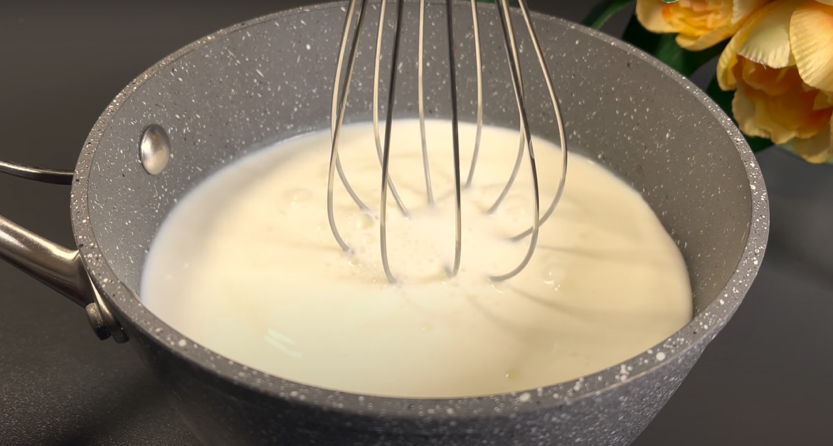 Do grubościennej patelni wlej mleko, dodaj 100 g cukru i postaw na ogniu. W międzyczasie wymieszaj w osobnej misce 2 łyżki kawy rozpuszczalnej z 2 łyżkami gorącej wody, a następnie wlej do mleka. Rozpuść skrobię w 50 ml zimnej wody i dodaj do mleka, mieszając. Gotuj, aż mleko zgęstnieje, mieszając trzepaczką.