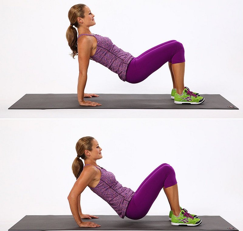 Usiądź na podłodze, rozłóż ręce w odległości ok. 15 cm od miednicy i oprzyj się na nich. Zegnij nogi w kolanach, a następnie podnieś miednicę do góry. Po kilku sekundach opuść miednicę. Wykonaj ćwiczenie w trzech seriach po 15 razy. Zwróć uwagę na to, aby mięśnie ramion dobrze się rozciągnęły.