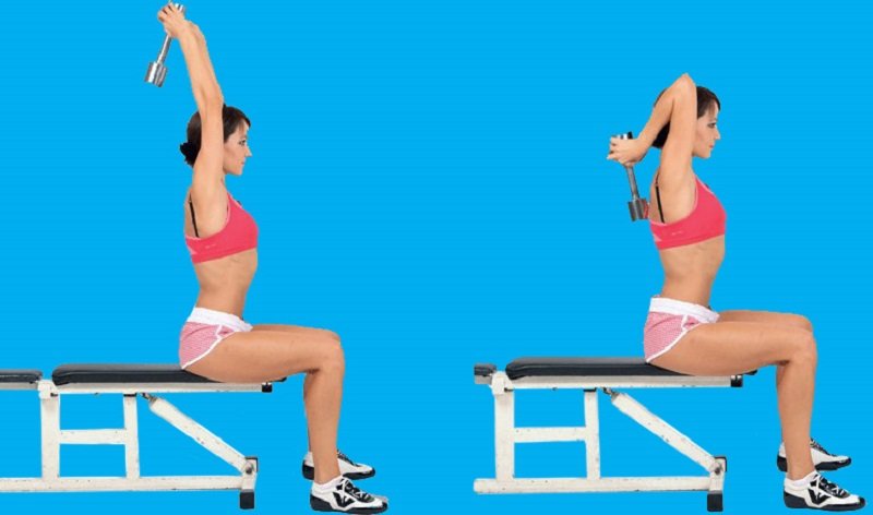 Do wykonania tego ćwiczenia wykorzystaj hantle o wadze 0,5-2 kg lub butelki z wodą. Usiądź na krześle. Trzymaj plecy prosto. Obejmij jedną hantlę obiema rękami i pociągnij nad głowę. Następnie zegnij ręce w łokciach, wkładając hantel za plecy. Wróć do pozycji wyjściowej. Zrób 3 powtórzenia po 15 razy. Podczas ćwiczenia nie opieraj się o krzesło ani nie odchylaj pleców.