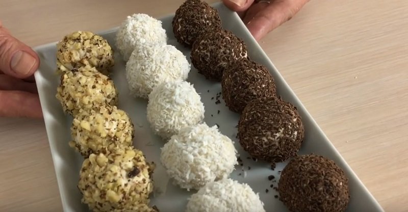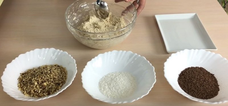 Dodaj herbatniki i orzechy do masy twarogowej. Po wymieszaniu masy można z niej uformować kulki. Można je obtoczyć w dowolnie wybranych składnikach. Gotowe ciasteczka włóż do lodówki na co najmniej godzinę. Po schłodzeniu są gotowe do spożycia.