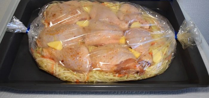 Wszystko mieszamy rękami, umytymi oczywiście, z dodatkiem soli. Na koniec dodajemy oleju słonecznikowego. Warzywa rozkładamy rękami w woreczku, a na to układamy udka kurczaka i do tego dodajemy masło w kawałkach.
