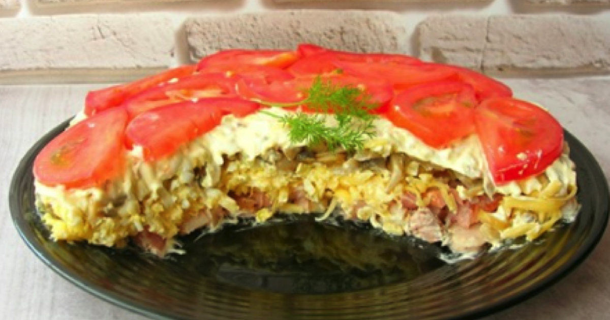 Kolejną warstwę tworzy połowa pokrojonych jaj, którą także należy posmarować majonezem, a następnie przykryć pieczarkami z cebulką. Ponownie kolej na pozostałe jaja i warstwę majonezu. Całość należy przykryć pomidorami pokrojonymi w plasterki.