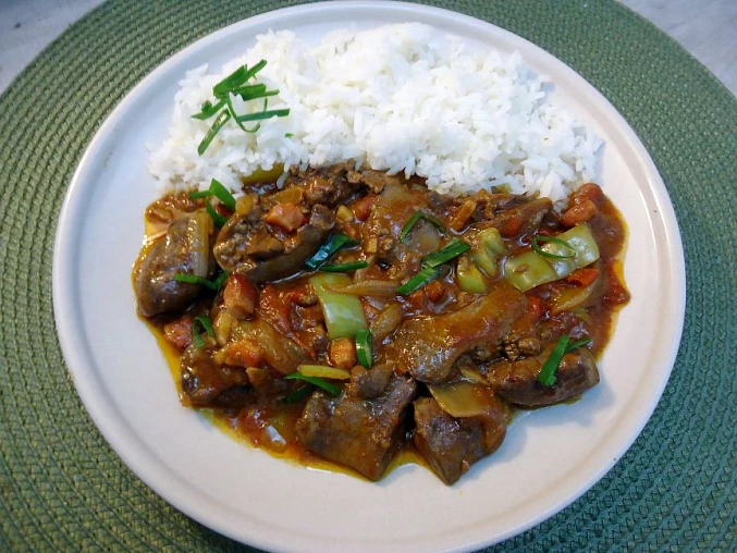 Pokrój cebulę, obierz i pokrój w ćwiartki, dodaj do boczku i pozwól się zeszklić, dodaj drobno posiekany czosnek i imbir i pozwól mu pachnieć. Dodaj odsączoną wątrobę do bazy, wymieszaj i podsmaż. Dodaj bulion w granulkach, sos, ketchup i w razie potrzeby dolej gorącej wody. Papryki oczyść i pokrój, dodaj do wątróbki i gotuj do miękkości. Dodaj sól i pieprz do smaku. Podawaj z ryżem lub pieczywem do smaku.
