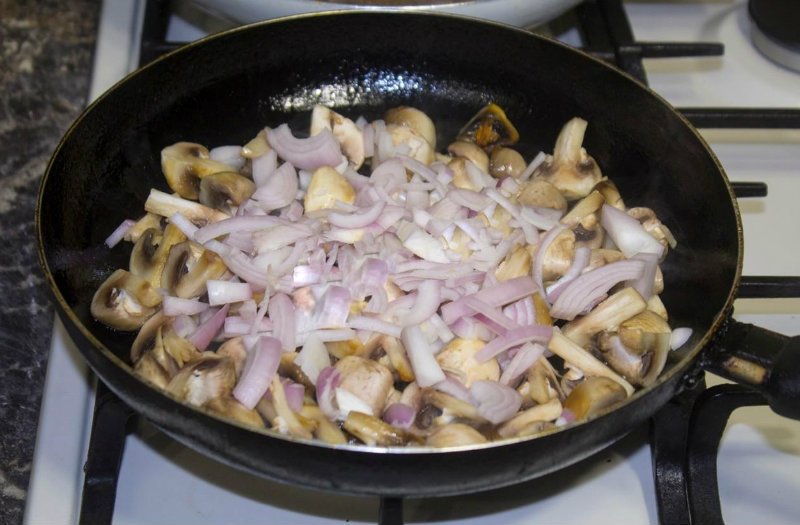 Krok 1 – W rondlu roztop 50 gramów masła. Pokrój cebulę na małe kawałki, a grzyby na duże kawałki. Podsmaż do uzyskania złotego koloru.