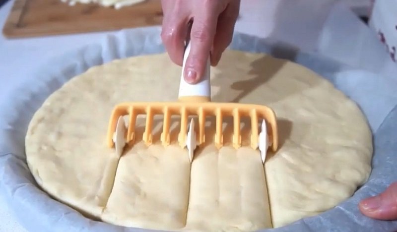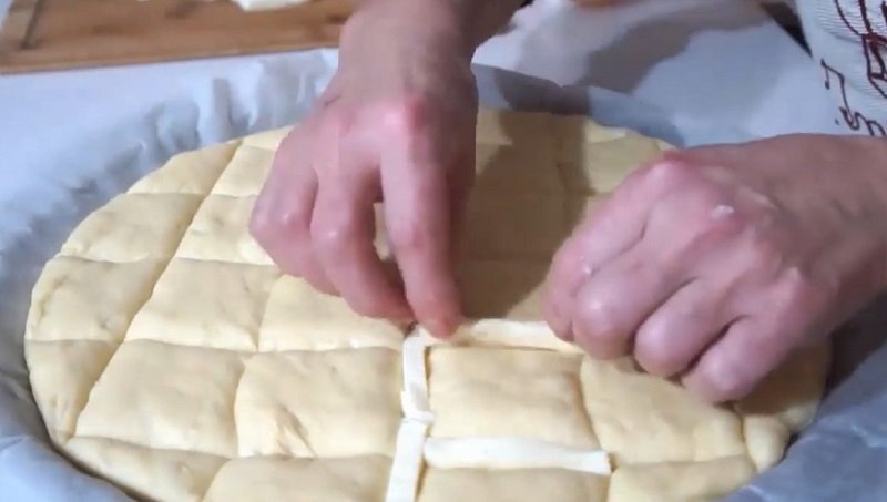 Okrągłą blachę przykrywamy pergaminem (papierem do pieczenia) i równo rozkładamy na niej nasze ciasto. Za pomocą noża wykonujemy nacięcia na cieście w postaci szachownicy. Na owych cięciach układamy pokrojoną mozzarellę.