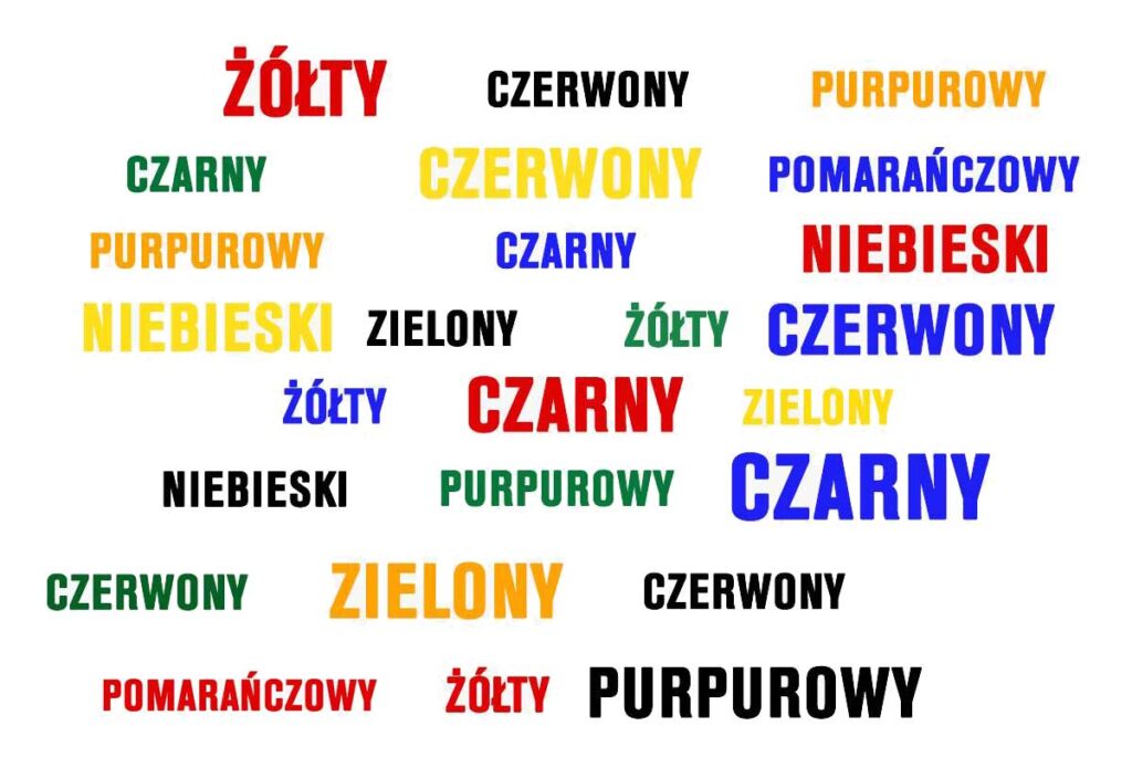 Przedstawiamy ćwiczenie „Kolorowe słowa”. Zadanie polega na wymawianiu słów, a nie kolorów, jakimi są napisane – i odwrotnie. Jest to doskonały trening dla obu półkul mózgu, zwiększający ich wzajemną komunikację i pomagający w prewencji choroby Alzheimera.