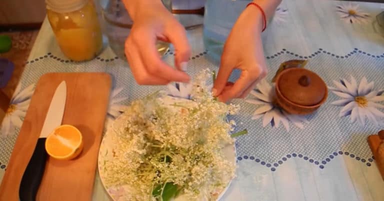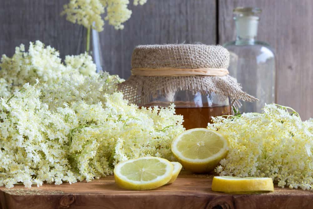 Wybierz słoneczny dzień i poszukaj krzewu czarnego bzu w ogrodzie lub innym miejscu z świeżym powietrzem. Zerwij z niego 8 większych kwiatostanów, oddzielając grubsze łodygi. Umieść kwiaty w słoju o pojemności 3,5 litra. Możesz dodać miętę lub inne zioła do smaku.