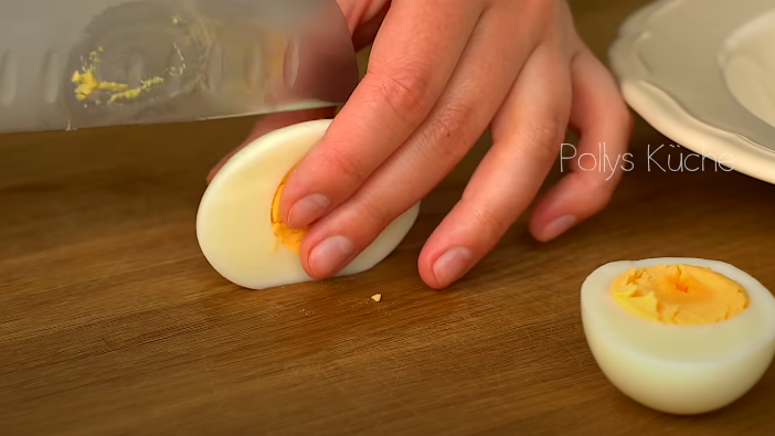 • Obierz jajka ze skorupek i pokrój w małe kostki.