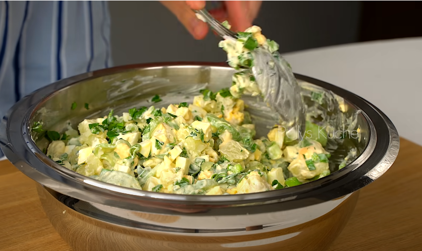 • Do miski dodaj pokrojone jajka, ziemniaki i odcedzone ogórki.